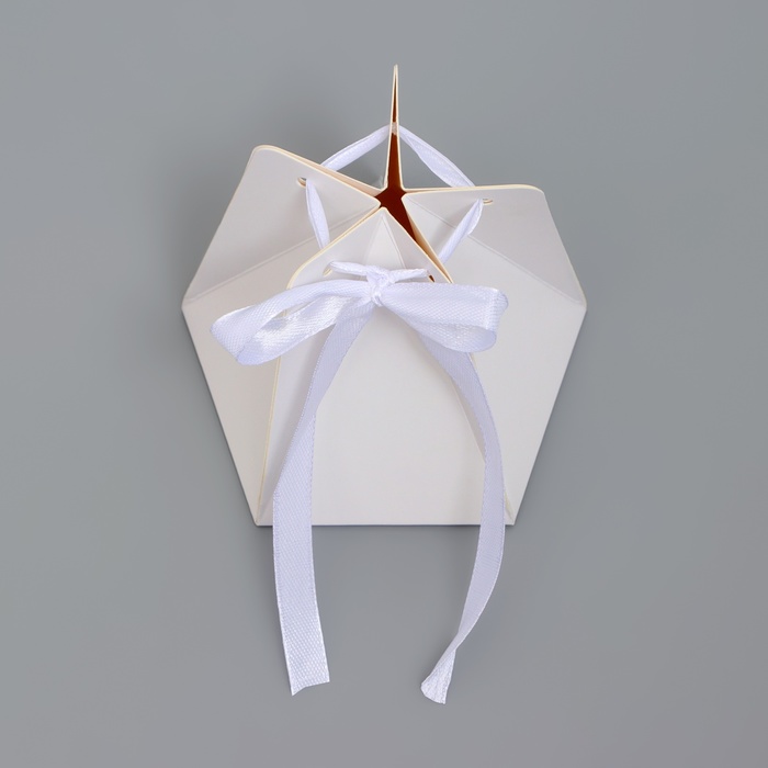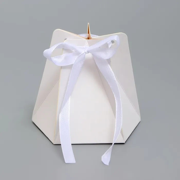 Коробка складная под конфеты, пирожные с лентой имеет размеры 6 х 9 см. Она выполнена из белого картона высокого качества, что обеспечивает прочность и долговечность.
