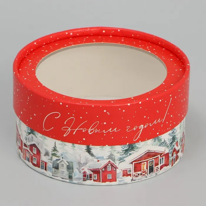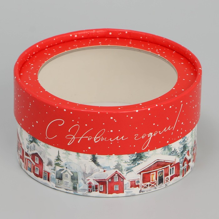 Коробка для макарун тубус с окном «Зимний город», 12 х 12 х 5 см