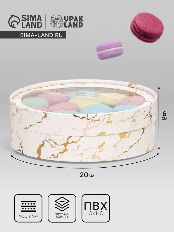 В коробке Тубус с окном ваши макаруны останутся свежими и мягкими, защищая их от воздействия воздуха и сохраняя их аромат и текстуру. Прочное пластиковое окно обеспечивает надежную защиту от пыли и грязи, сохраняя внешний вид макарун на высшем уровне.