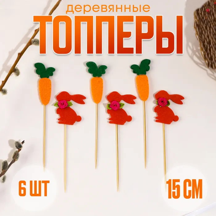 Топпер на пасху «Заяц», с бантиком и морковкой, набор 6 шт.