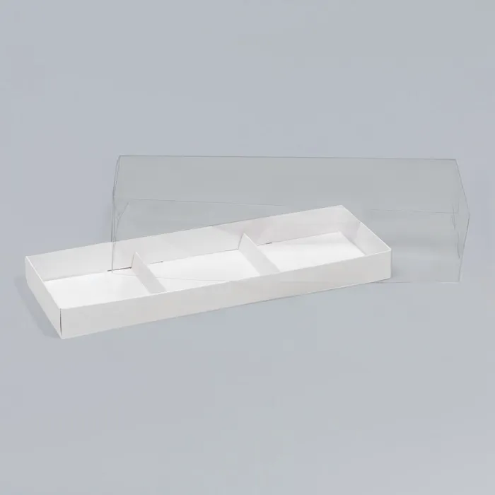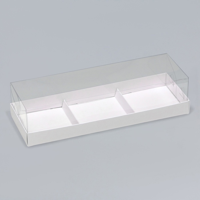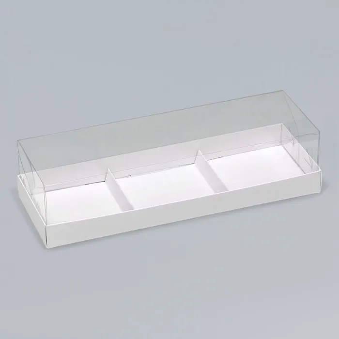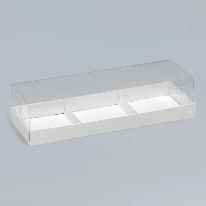 Размер коробки составляет 26 x 8,5 x 6 см, что позволяет разместить три муссовых пирожных. Благодаря компактным размерам и удобной форме, коробка легко помещается на витрине магазина или на столе клиента.