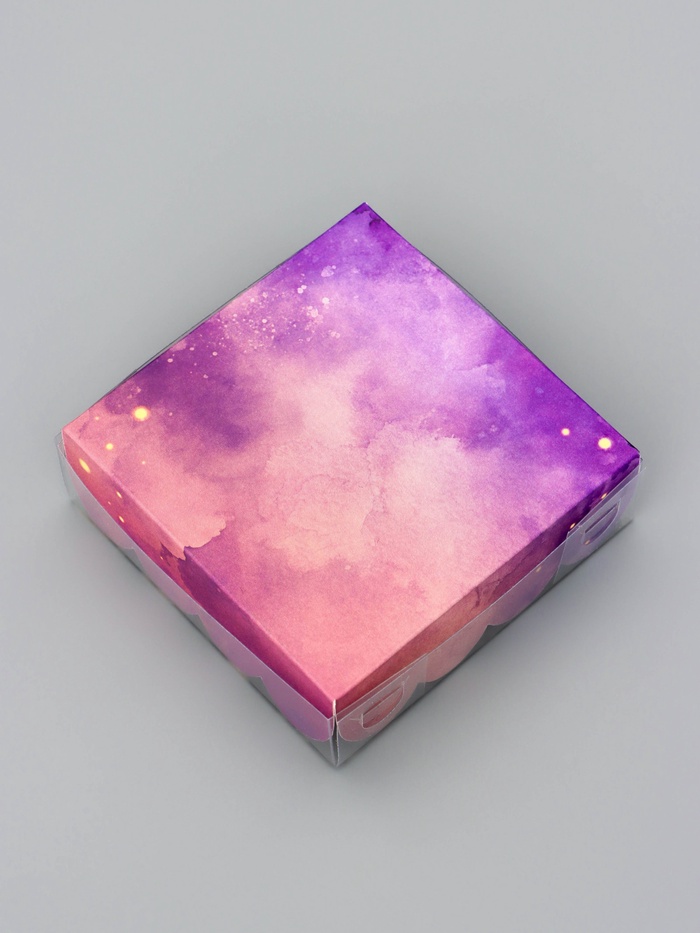 Прочный картон обеспечивает надежную защиту содержимого, а прозрачная крышка позволяет сразу оценить внешний вид угощений без необходимости открывать коробку.