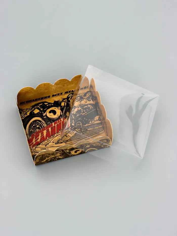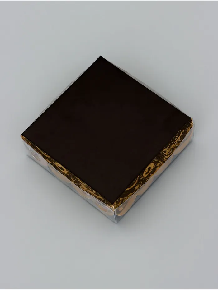 Прочный картон обеспечивает надежную защиту содержимого, а прозрачная крышка позволяет сразу оценить внешний вид угощений без необходимости открывать коробку.