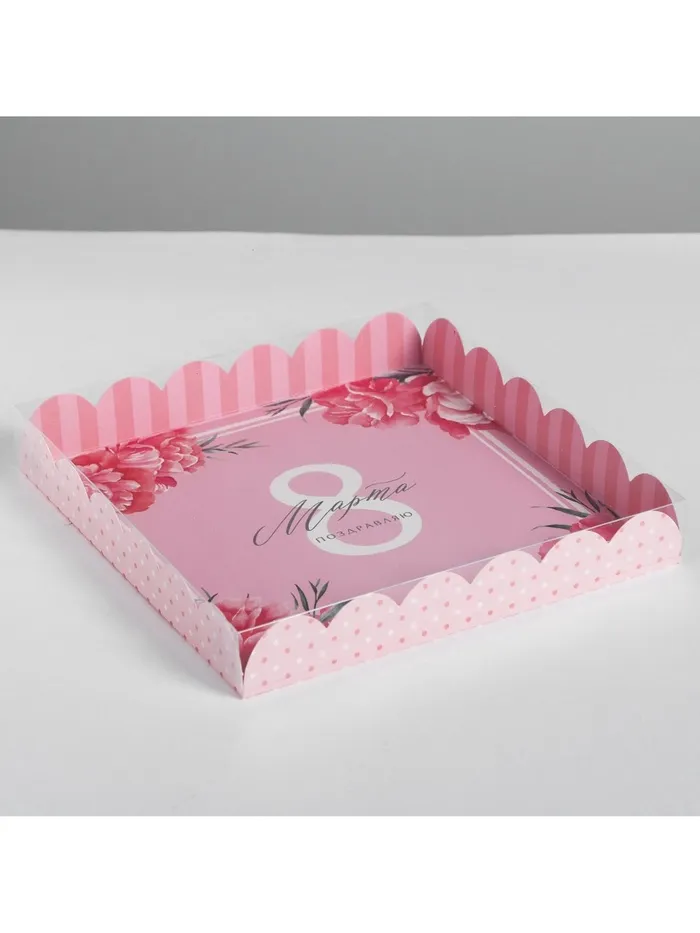 Коробка для печенья, кондитерская упаковка с пластиковой крышкой, «8 марта», 21 х 21 х 3 см — Характеристики