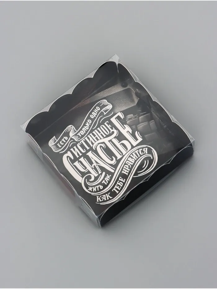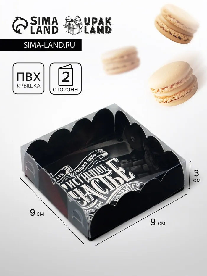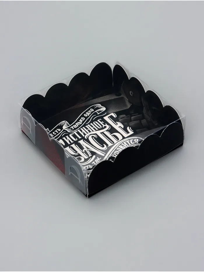 Прочный картон обеспечивает надежную защиту содержимого, а прозрачная крышка позволяет сразу оценить внешний вид угощений без необходимости открывать коробку.