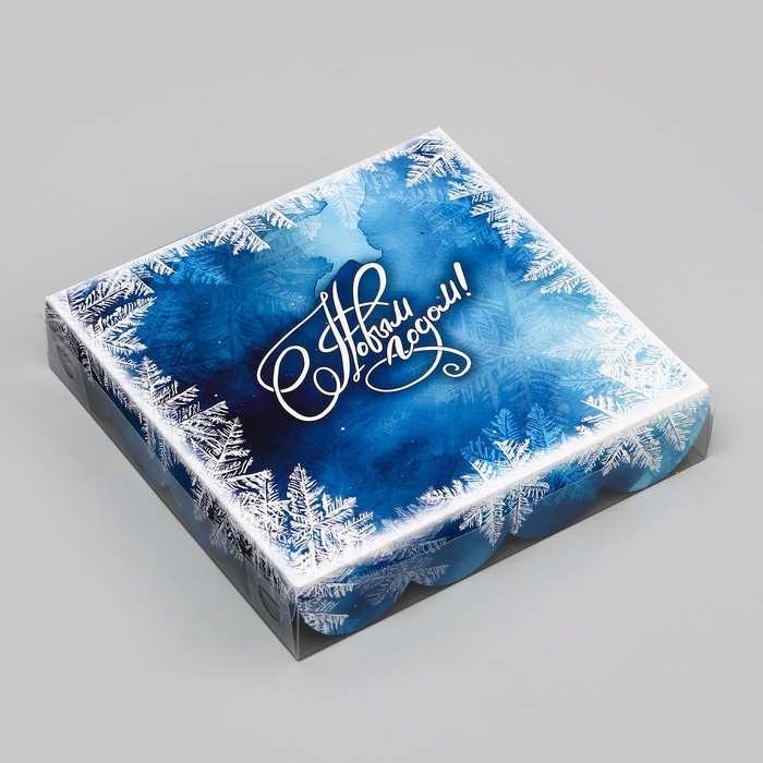 Стильная коробка с ярким зимним дизайном и прозрачной ПВХ крышкой подходит не только для печенья, но и для других десертов: пирожных, пряников или шоколадных конфет.
