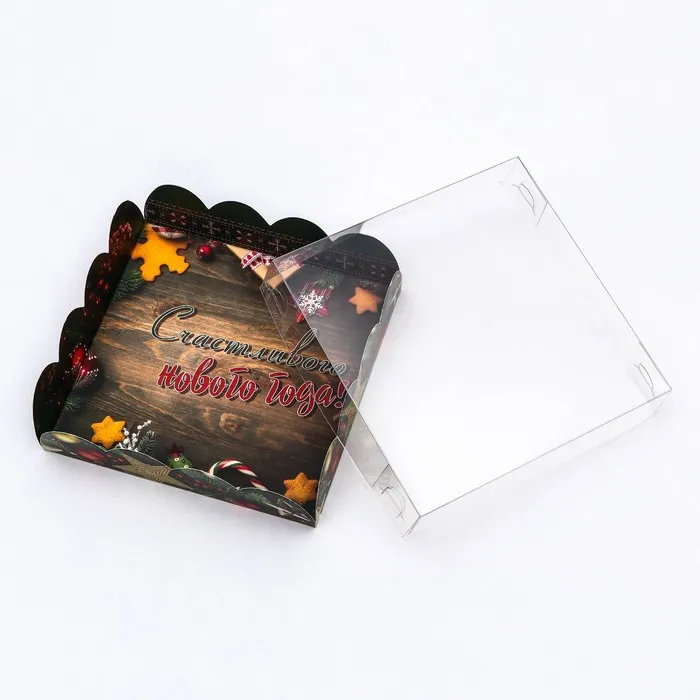 Коробка для печенья с прозрачной крышкой, можно видеть содержимое коробки. Прекрасно подойдет для десертов, можно использовать для праздничного декора.