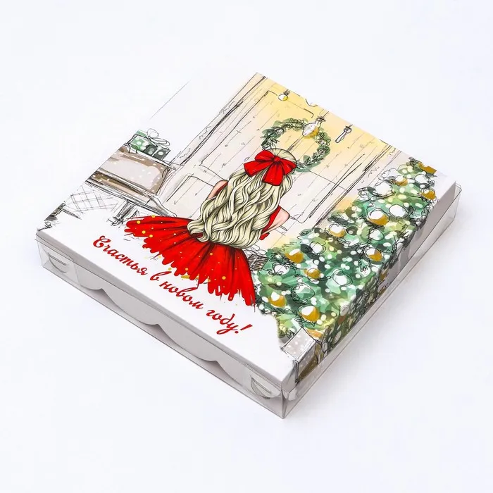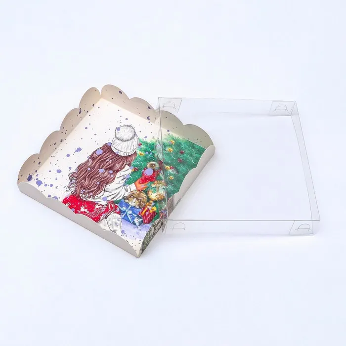 Коробка для печенья с прозрачной крышкой, можно видеть содержимое коробки. Прекрасно подойдет для десертов, можно использовать для праздничного декора.