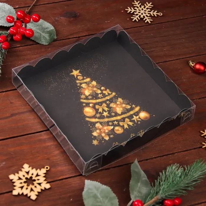 Коробка для печенья с прозрачной крышкой, можно видеть содержимое коробки. Прекрасно подойдет для десертов, можно использовать для праздничного декора.