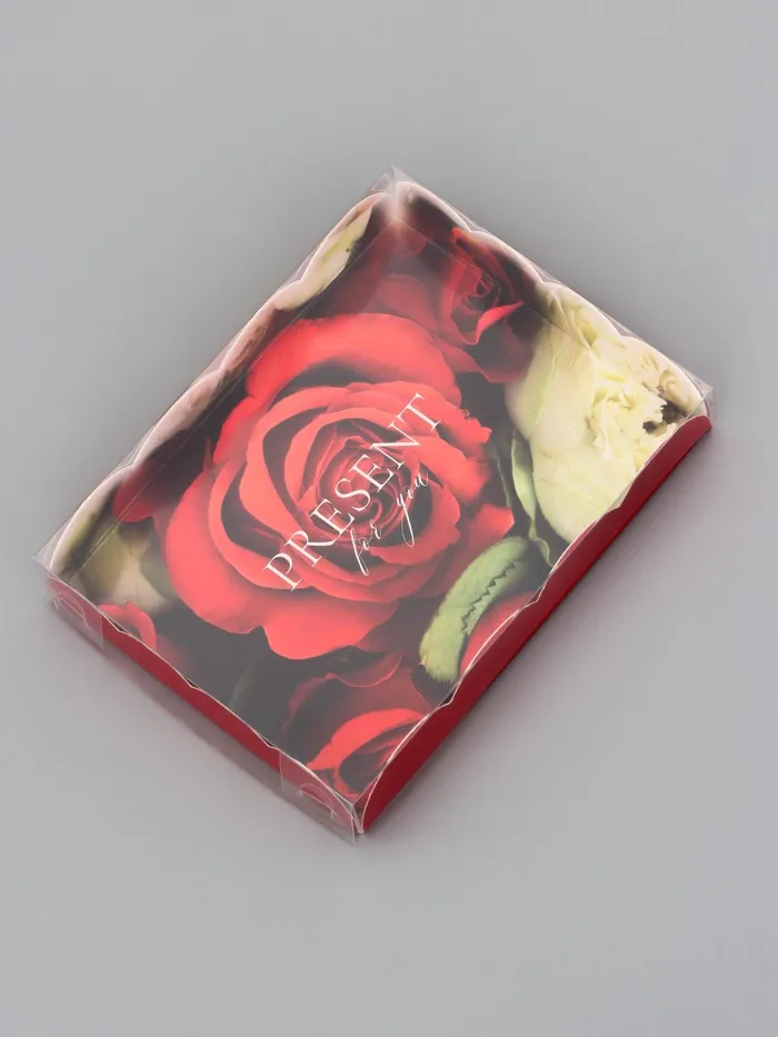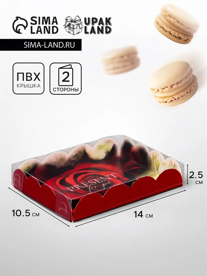 Прочный картон обеспечивает надежную защиту содержимого, а прозрачная крышка позволяет сразу оценить внешний вид угощений без необходимости открывать коробку.