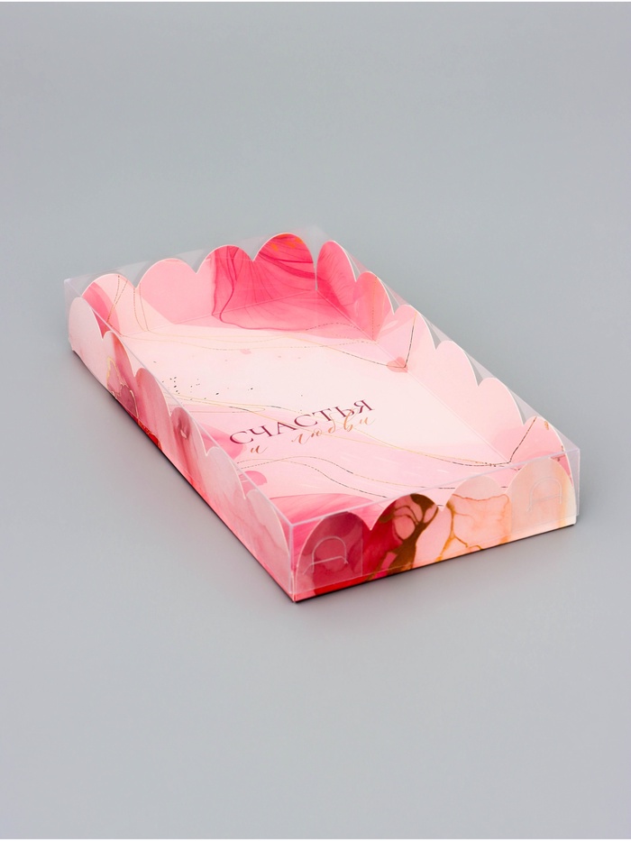 Прочный картон обеспечивает надежную защиту содержимого, а прозрачная крышка позволяет сразу оценить внешний вид угощений без необходимости открывать коробку.