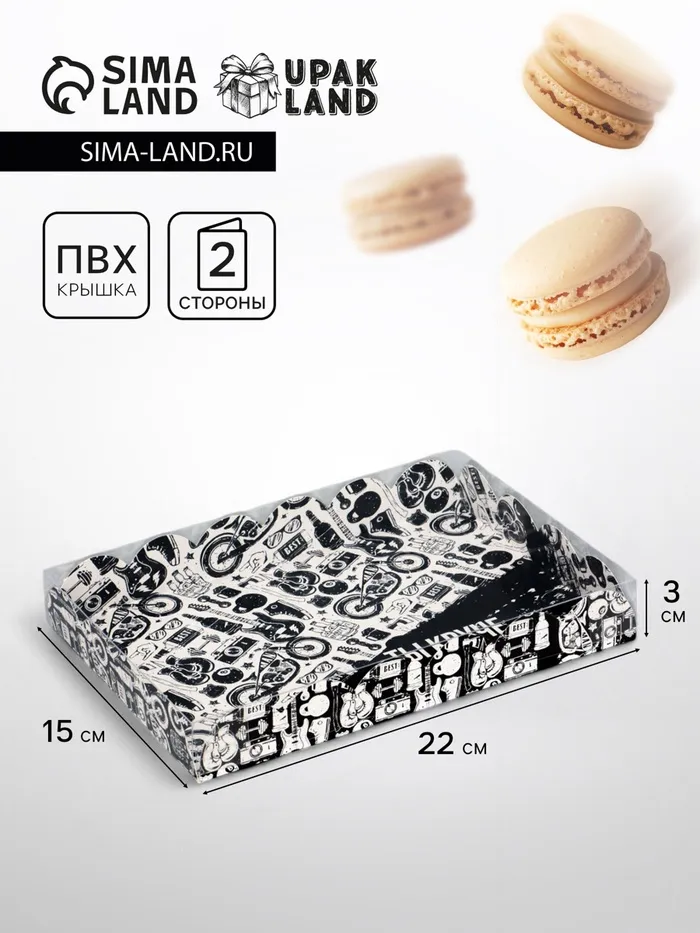 Прочный картон обеспечивает надежную защиту содержимого, а прозрачная крышка позволяет сразу оценить внешний вид угощений без необходимости открывать коробку.
