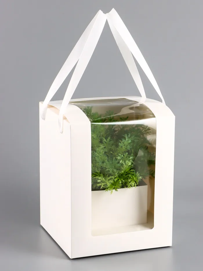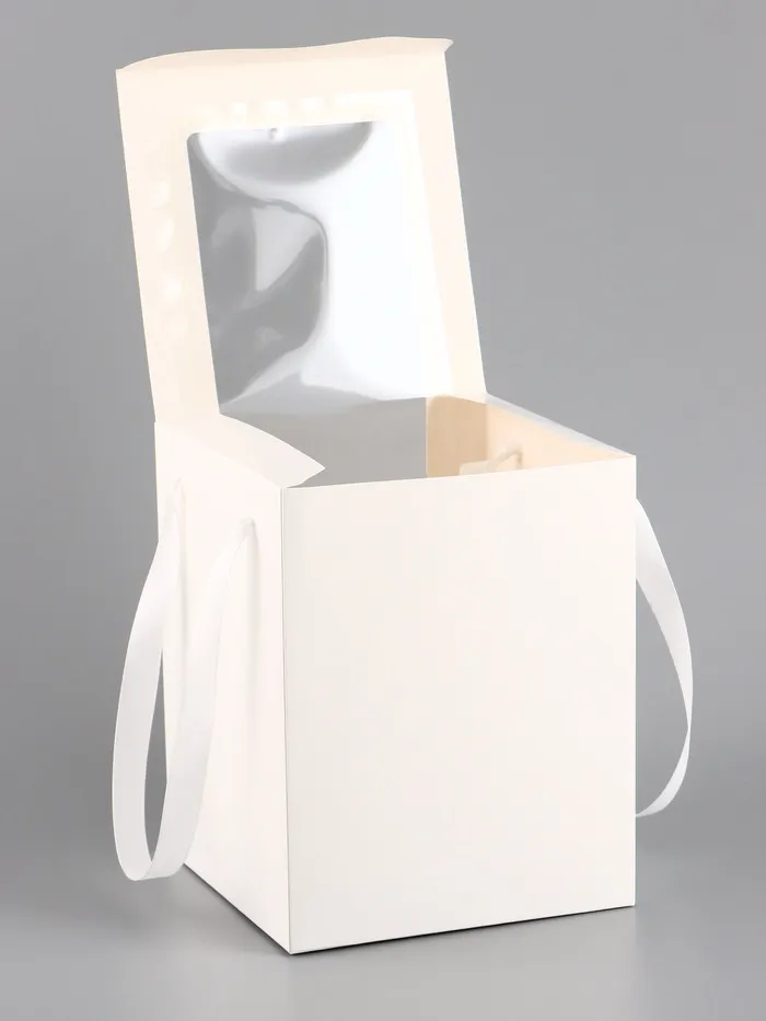 Белая складная коробка для цветов — универсальное решение для упаковки букетов или подарков. Её лаконичный дизайн и прозрачное окошко делают её подходящей для праздников, таких как 8 Марта, 14 Февраля или День рождения. Коробка сочетает в себе практичность и эстетику, подчёркивая красоту содержимого.