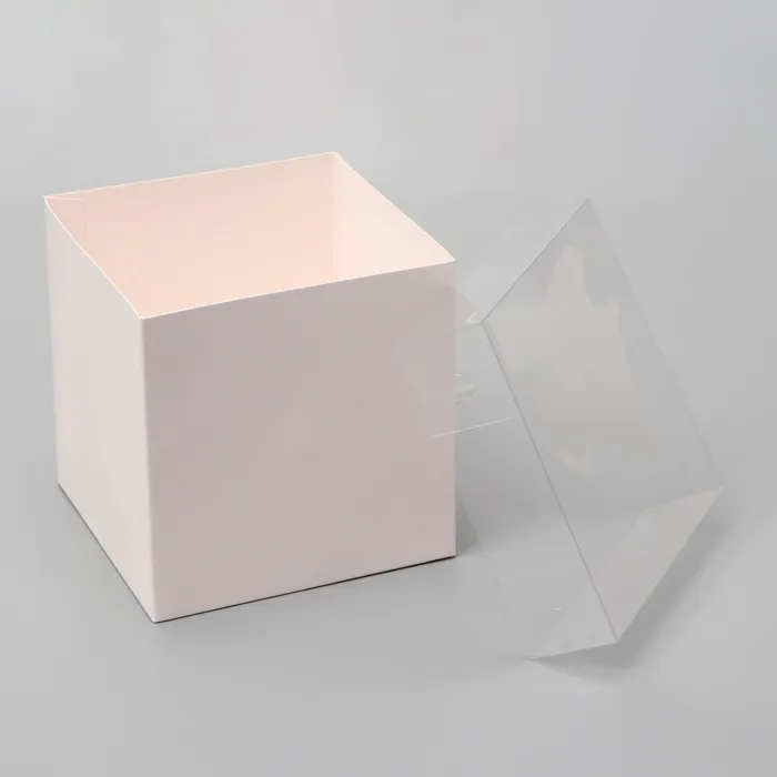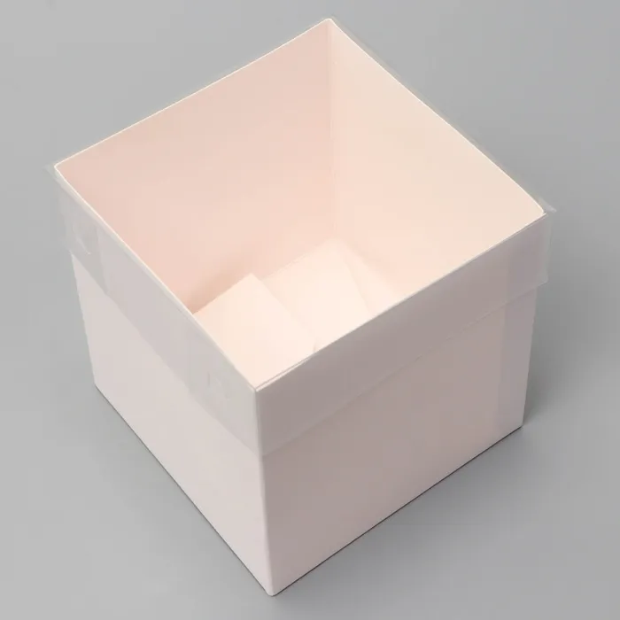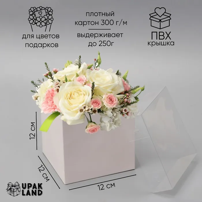 Коробка для цветов с PVC крышкой имеет размеры 12 см в длину, 12 см в ширину и 12 см в высоту. Она выполнена из высококачественного картона, который обеспечивает прочность и долговечность.