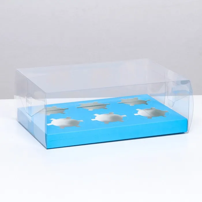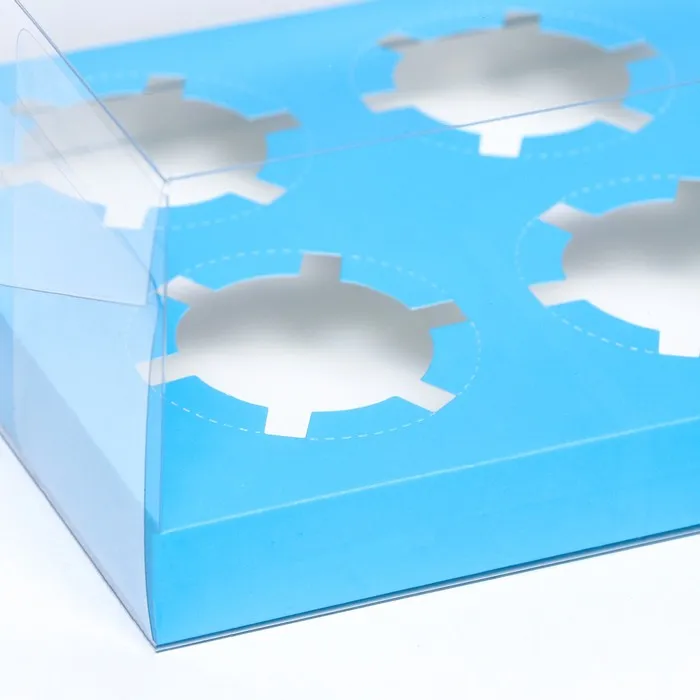 Упаковка для капкейков. Изготовлена из плотного картона и PVC. Используют для упаковки и транспортировки капкейков при доставке. Благодаря окошку можно рассмотреть товар внутри коробки, не открывая ее.
