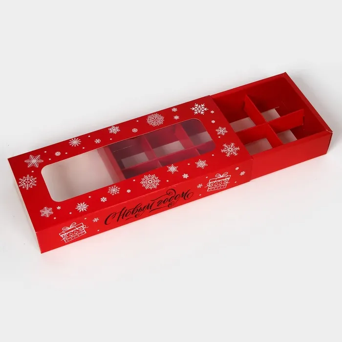 Коробка имеет прямоугольную форму и состоит из двух частей: верхней крышки и нижней части. Верхняя крышка украшена красивым рисунком, который подчеркивает новогоднюю тематику. Нижняя часть коробки предназначена для размещения конфет.