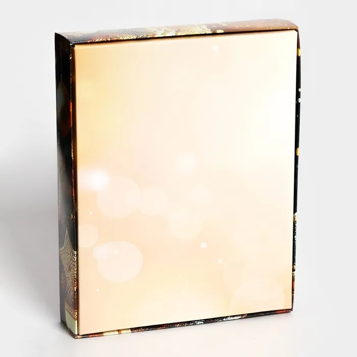 Коробка имеет прямоугольную форму и состоит из двух частей: верхней крышки и нижней части. Верхняя крышка украшена красивым рисунком, который подчеркивает новогоднюю тематику. Нижняя часть коробки предназначена для размещения конфет.