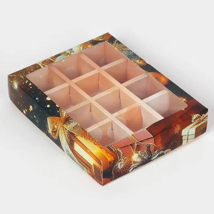 Размеры коробки позволяют упаковать 12 штук конфет, что делает ее удобной для использования в качестве подарка или для домашнего использования. Коробка изготовлена из качественного картона, который обеспечивает надежную защиту содержимого от внешних воздействий.