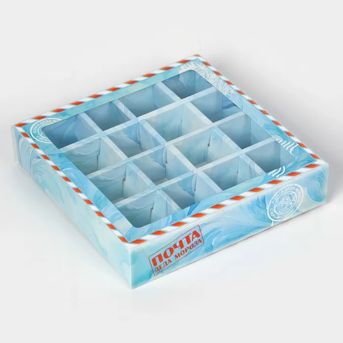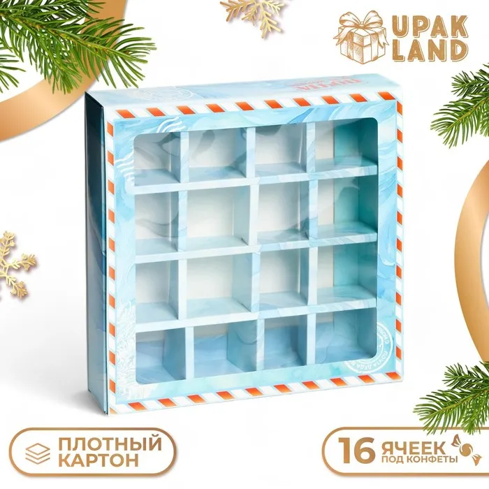 Коробка под 16 конфет "Новогодняя" размером 17,7х17,7х3,8 см - это прекрасный выбор для упаковки сладостей к празднику. Она выполнена в ярких новогодних цветах, что создает атмосферу праздника и волшебства.