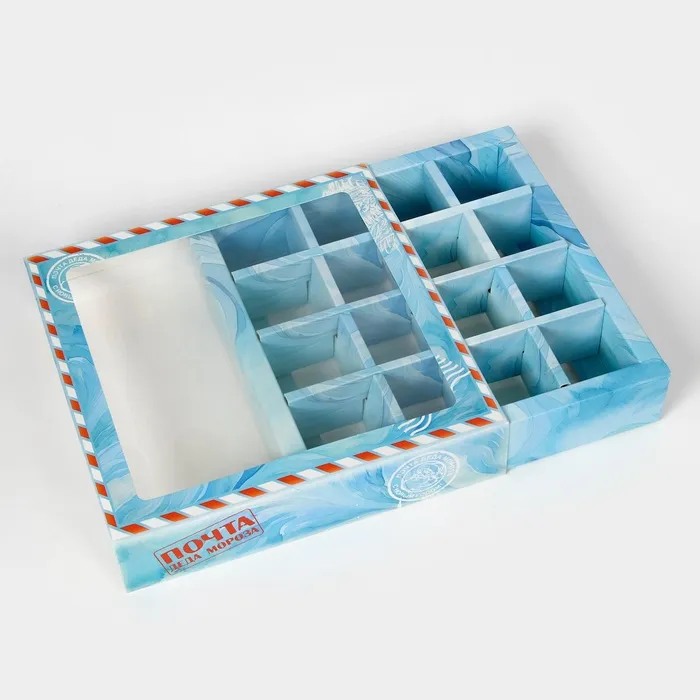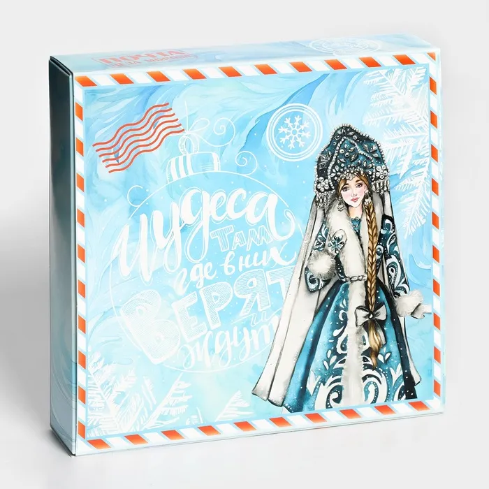 Коробка имеет квадратную форму и состоит из двух частей: верхней крышки и нижней части. Верхняя крышка украшена красивым рисунком, который подчеркивает новогоднюю тематику. Нижняя часть коробки предназначена для размещения конфет.