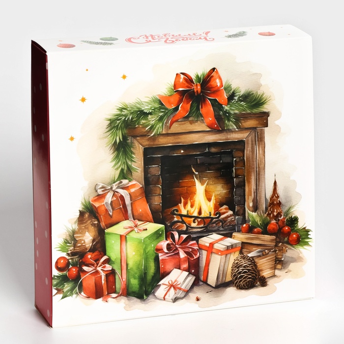 Коробка имеет квадратную форму и состоит из двух частей: верхней крышки и нижней части. Верхняя крышка украшена красивым рисунком, который подчеркивает новогоднюю тематику. Нижняя часть коробки предназначена для размещения конфет.