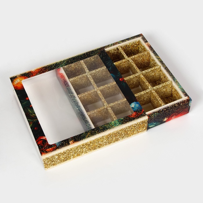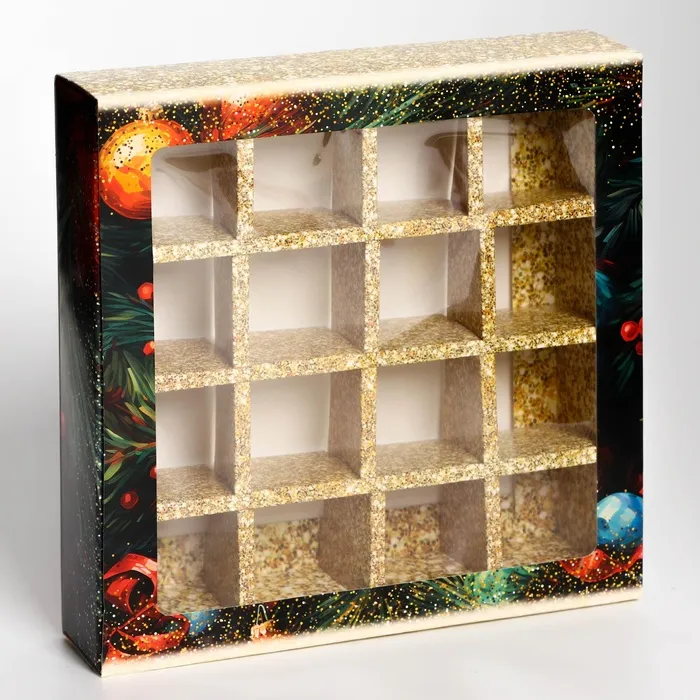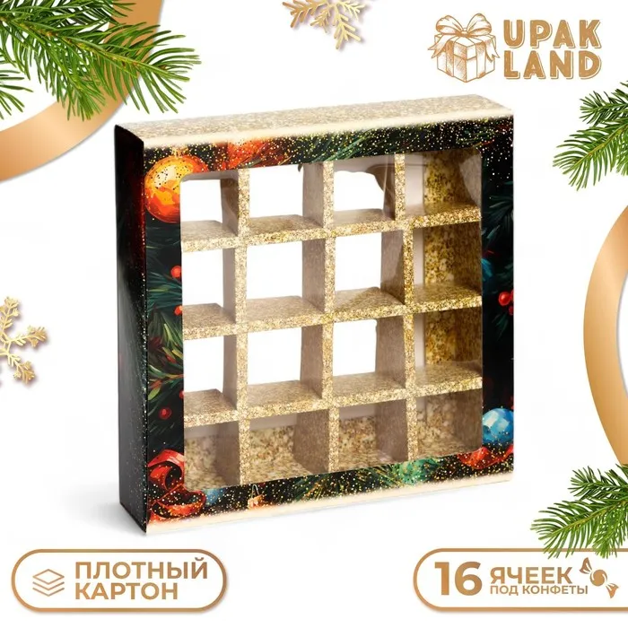 Коробка под 16 конфет "Новогодняя" размером 17,7х17,7х3,8 см - это прекрасный выбор для упаковки сладостей к празднику. Она выполнена в ярких новогодних цветах, что создает атмосферу праздника и волшебства.