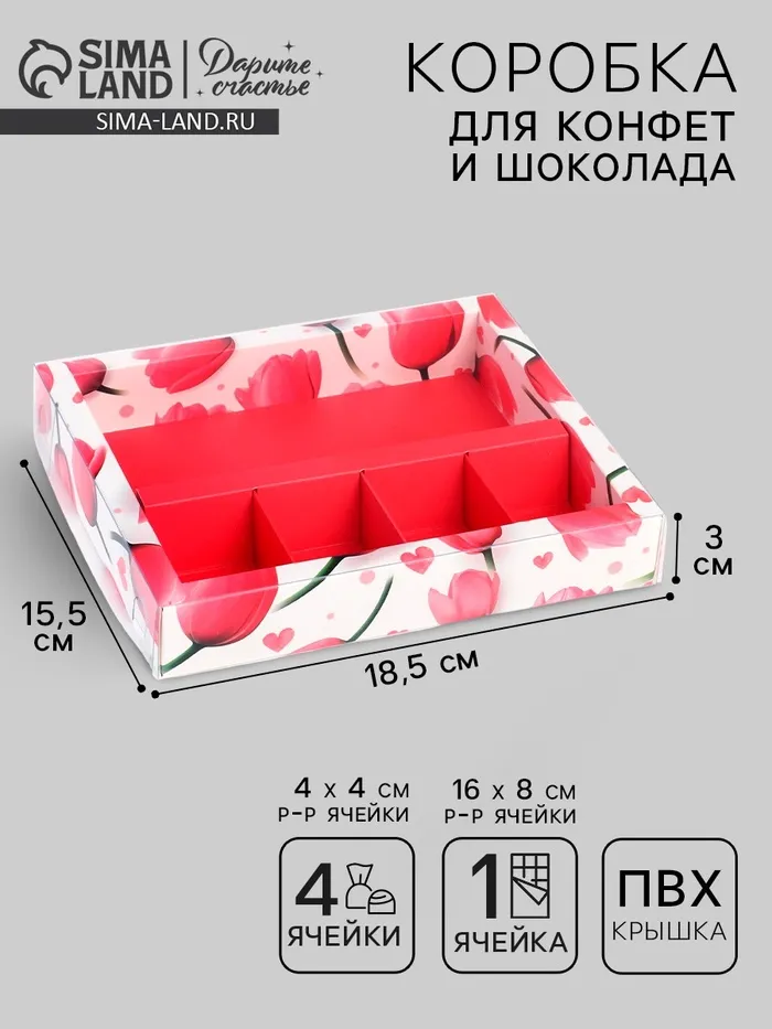 Коробка под 4 конфеты и шоколад с ячейками «Тюльпаны» 18.8 х 15.7 х 3 см — Характеристики