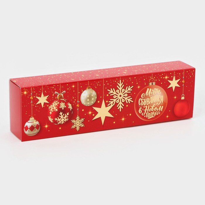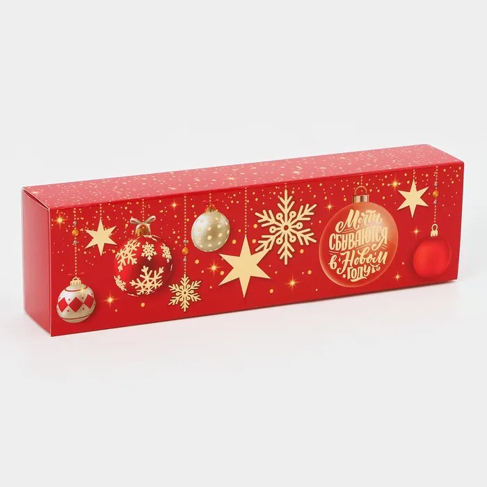 - Яркий новогодний дизайн создаст атмосферу праздника, а прочный картон обеспечит надежную защиту сладостей.
