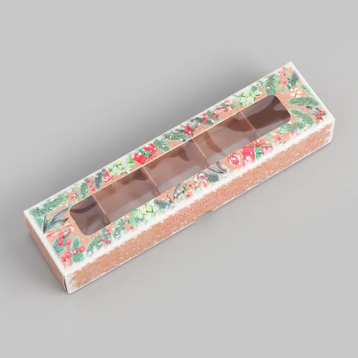 Коробка под 5 конфет "Новогодняя" размером 21х5х3,3 см - это прекрасный выбор для упаковки сладостей к празднику. Она выполнена в ярких новогодних цветах, что создает атмосферу праздника и волшебства.