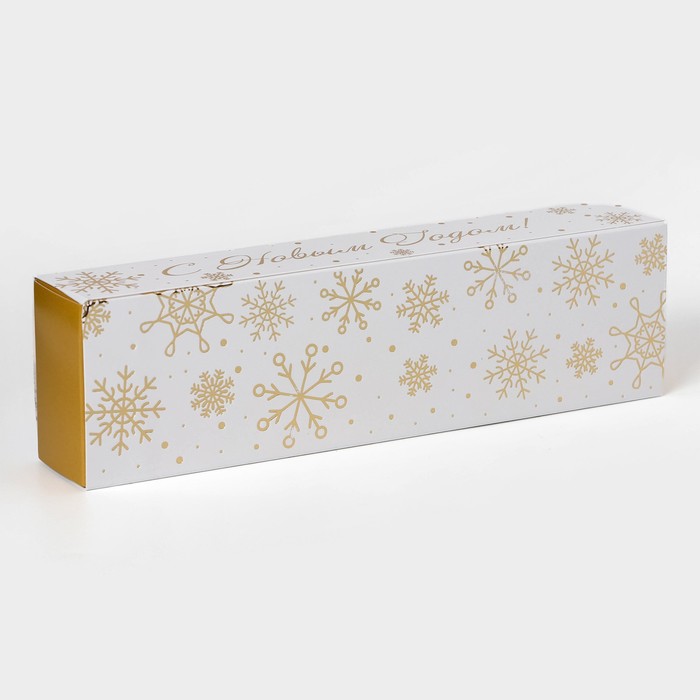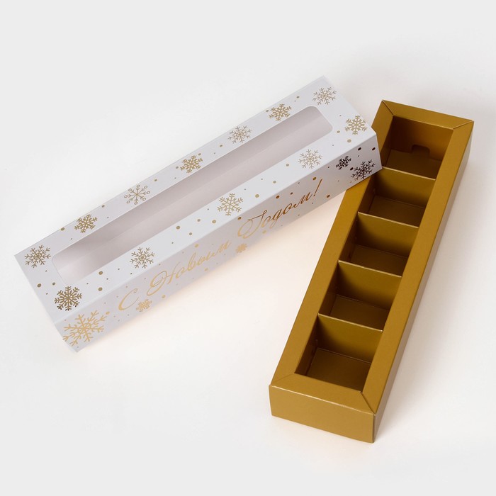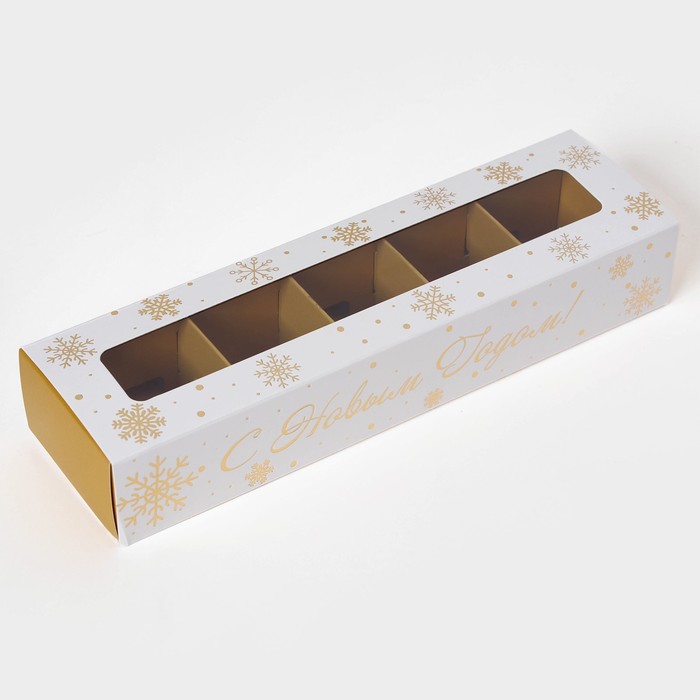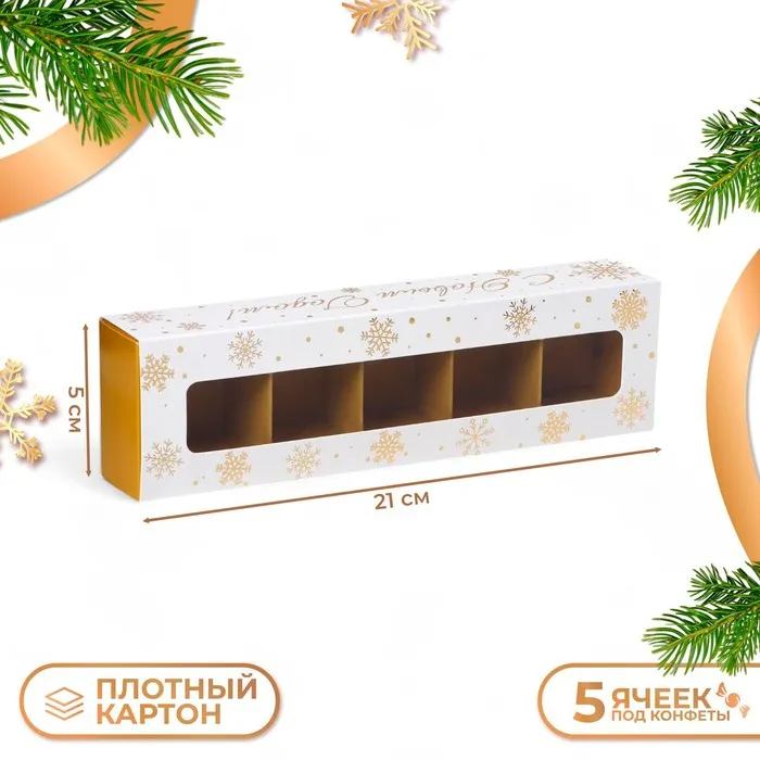 Новогодняя коробка для 5 конфет с обечайкой и окном, размером 21 х 5 х 3,3 см — изысканная упаковка для сладких подарков, сочетающая стиль и практичность. Она предназначена для размещения пяти конфет или шоколадных изделий, обеспечивая их удобное и надежное хранение. Прозрачное окно на обечайке позволяет красиво продемонстрировать содержимое, сохраняя его свежесть и аппетитный вид, что добавляет элемент предвкушения при вручении подарка.
