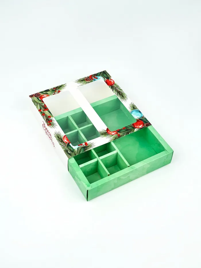 Одной из отличительных особенностей этой коробки является наличие окна, которое позволяет увидеть часть сладких угощений внутри. Это делает подарок ещё более привлекательным, поскольку дополнительно подчеркивает красоту и качество конфет и шоколада, находящихся внутри. Окно добавляет элемент интриги и создает ощущение волшебства, характерное для праздников.