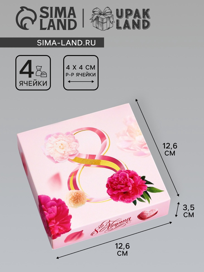 Изготовлена из высококачественного картона и имеет размеры 17,7 х 17,8 х 3,8 см, она идеально подходит для 8 конфет и одной плитки шоколада.