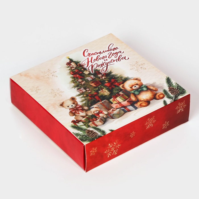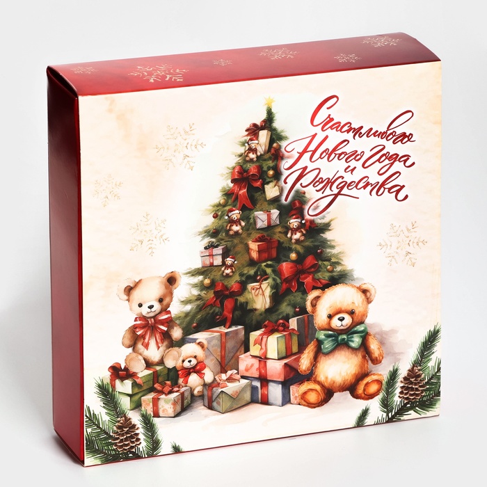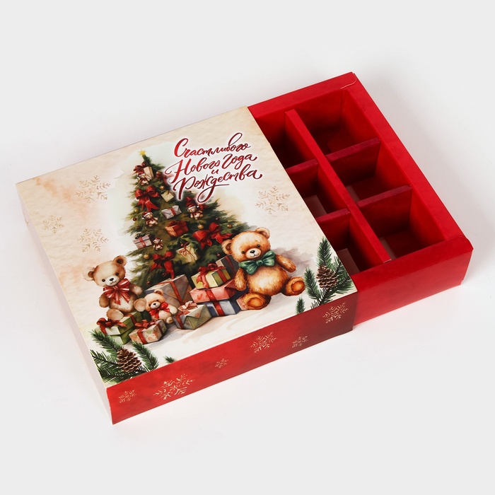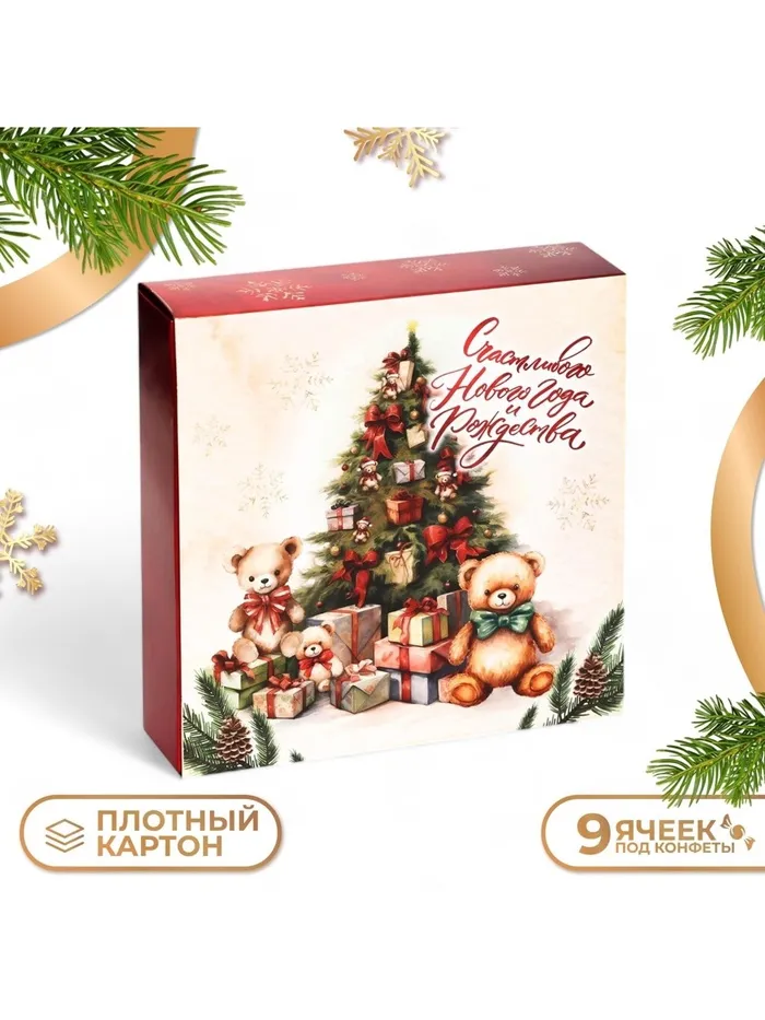 Эта новогодняя подарочная коробка для конфет – идеальный вариант для создания праздничного настроения и приятных сладких сюрпризов. С размерами 13,7 х 13,7 х 3,5 см, она вмещает ровно 9 конфет, что делает её компактной и аккуратной, но в то же время способной подарить массу удовольствия.