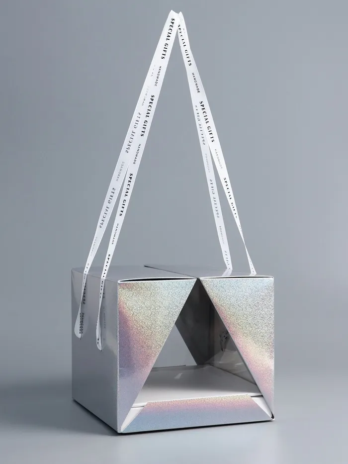 Особенность этой коробки заключается в том, что её картонные боковинки открываются, словно лепестки цветка, предоставляя легкий доступ к содержимому и добавляя процессу распаковки элементы интриги и восторга. Такое нестандартное решение подчеркивает уникальность вашего подарка и создает атмосферу настоящего торжества.