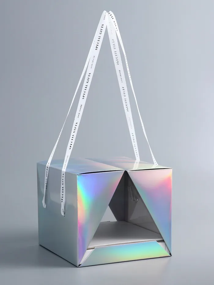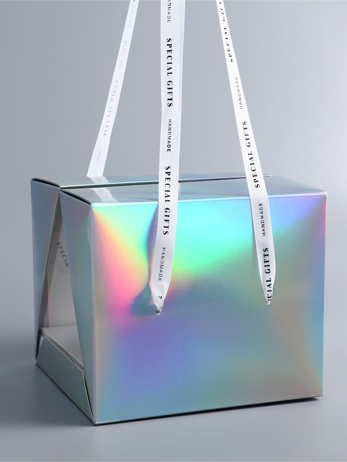 Серебристая голографическая поверхность коробки создаёт удивительный визуальный эффект, меняющийся в зависимости от угла освещения, что придаёт упаковке дополнительную динамику и притягательность.