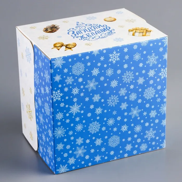 Коробка выполнена из плотного картона, украшенного новогодним дизайном, который создает атмосферу волшебства и праздника.