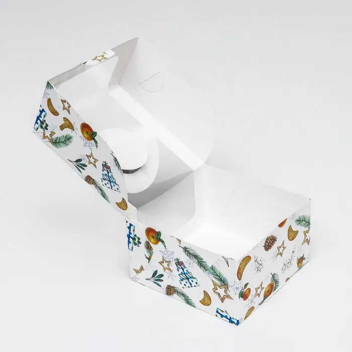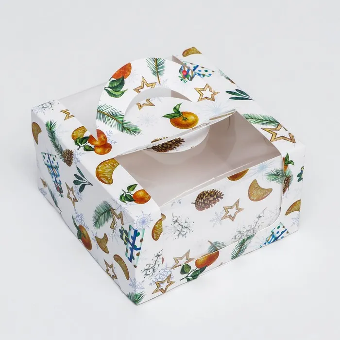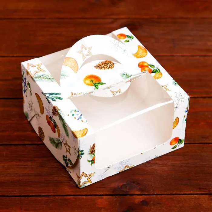 Коробка под бенто - торт с окном «Мандарины и звезды», 14×14×8 см, Новый год — Характеристики