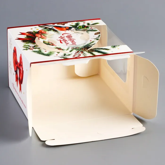 Новогодняя коробка для бенто-торта с окном — это стильная и праздничная упаковка, разработанная специально для небольших тортов, которые станут идеальным подарком или угощением в зимний сезон. Коробка выполнена из плотного картона, украшенного новогодним дизайном, который создает атмосферу волшебства и праздника.