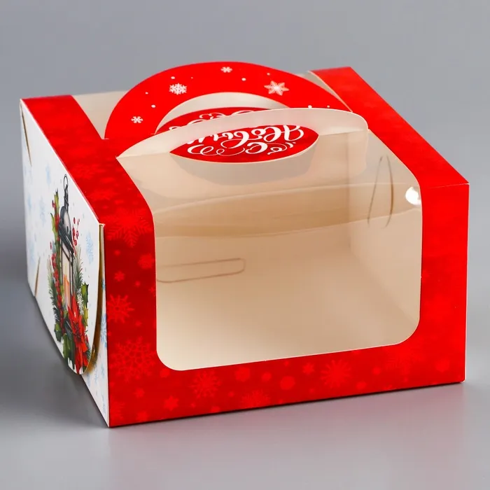 Новогодняя коробка для бенто-торта с окном — это стильная и праздничная упаковка, разработанная специально для небольших тортов, которые станут идеальным подарком или угощением в зимний сезон. Коробка выполнена из плотного картона, украшенного новогодним дизайном, который создает атмосферу волшебства и праздника.