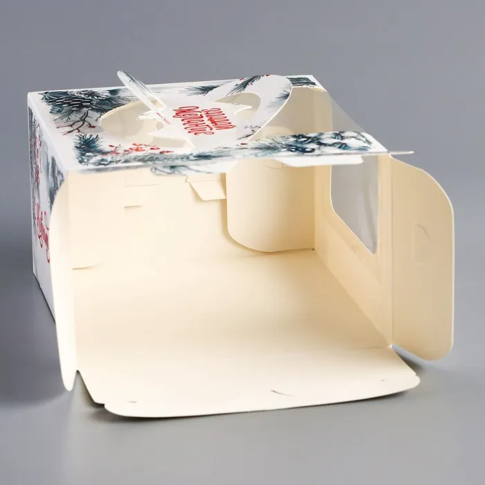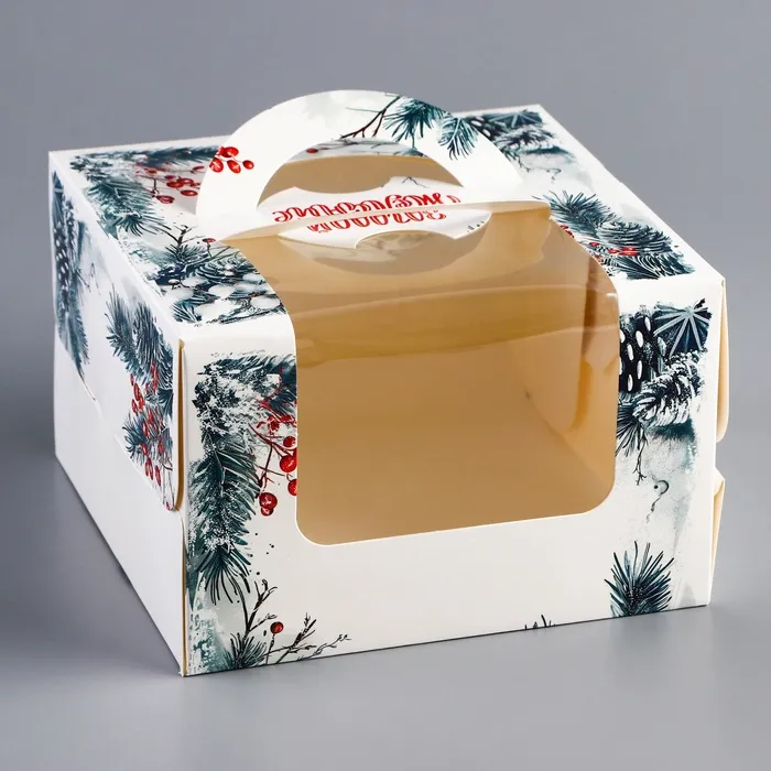 Новогодняя коробка для бенто-торта с окном — это стильная и праздничная упаковка, разработанная специально для небольших тортов, которые станут идеальным подарком или угощением в зимний сезон.