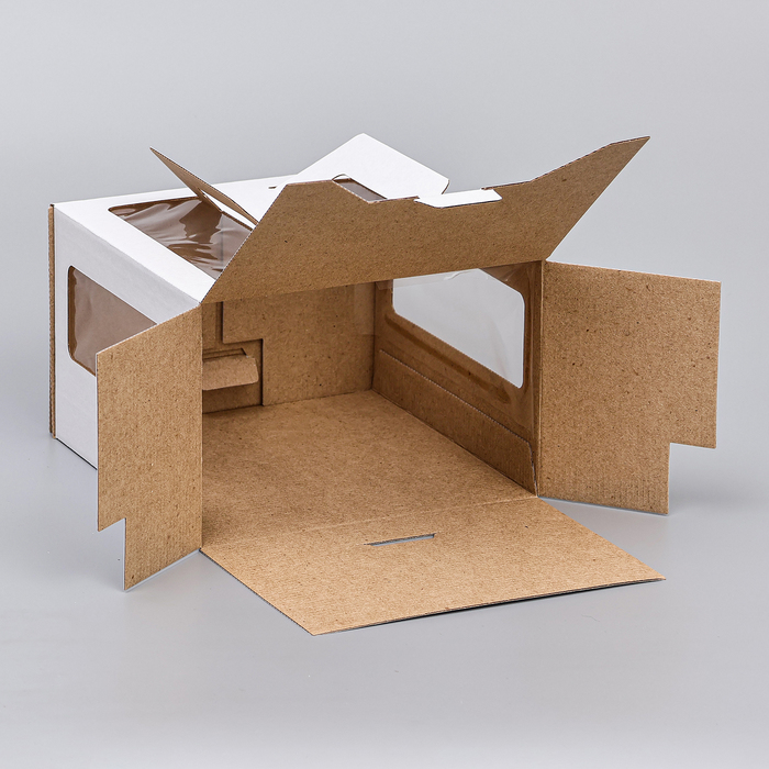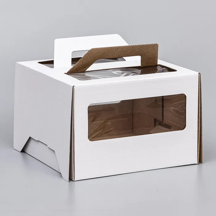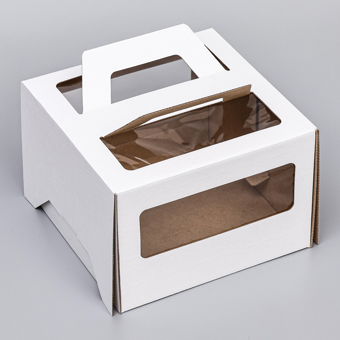 Коробка под торт 2 окна, с ручками, белая, Коробка для торта, десерта и выпечки. Кондитерская упаковка, упаковка для сладостей, пирожных, пирогов, подарочная коробка идеально подходит для переноса и перевозки тортов и десертов, кексов, пирожных. Прочная и удобная самосборная белая коробка для торта имеет 2 вклеенных окна. Конструкция легко собирается и надёжно защищает десерт внутри коробки. Смотрится красиво и празднично. Прекрасно украсит праздничный и сладкий стол на такие праздники как детский День Рождения, подарок любимой, свадьба, выпускной, девичник, мальчишник, юбилей и просто тематический вечер. С нашими коробками для выпечки и тортов вы сможете сделать незабываемый подарок на: день рождения, подарок любимой, пасха, 8 марта, 23 февраля, новый год. Хорошо подойдет пекарням, кондитерским магазинам и домашним кондитерам.