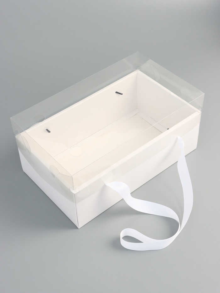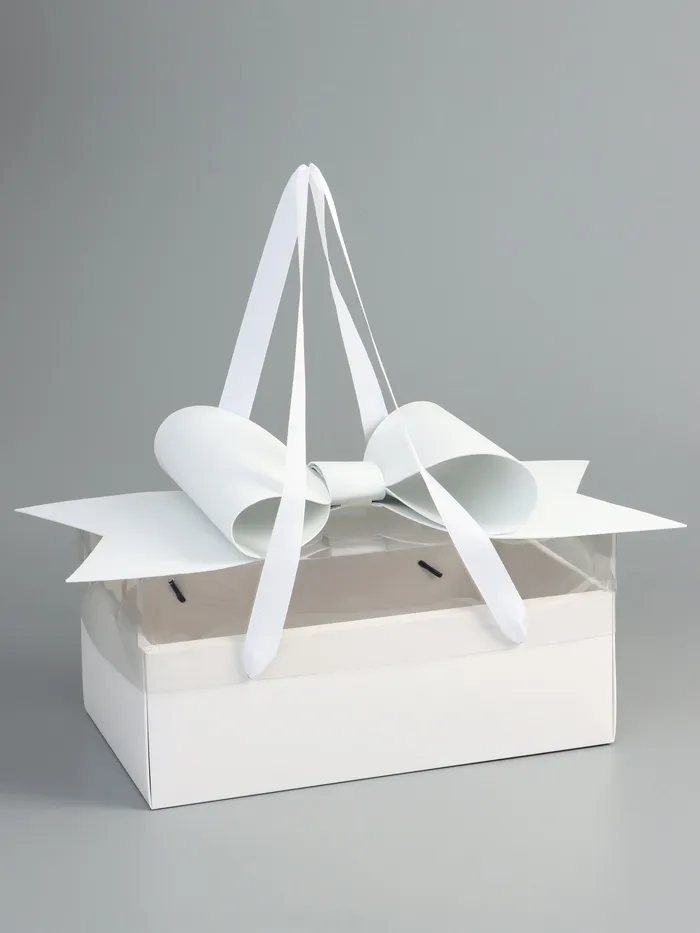 Коробка подарочная с бантом, ручками и прозрачной крышкой — идеальный выбор для упаковки вашего подарка.