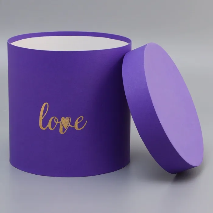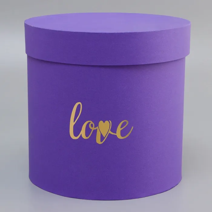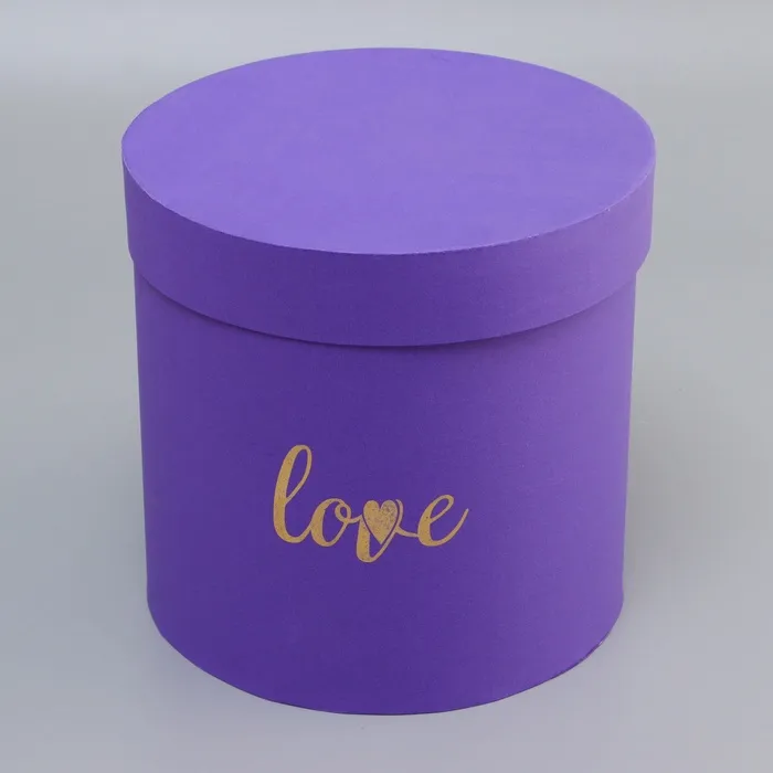 - Элегантный дизайн: Круглая конструкция с аккуратным тиснением «Love» добавляет изысканности любому подарку. Фиолетовый цвет символизирует таинственность и глубину чувств, превращая коробку в часть подарка.