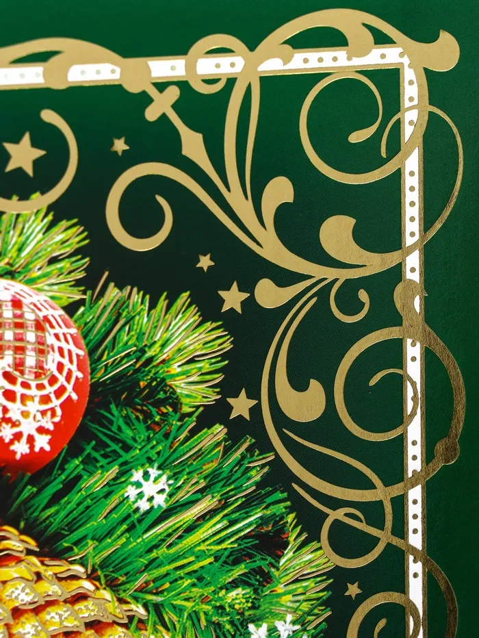 - Яркий новогодний дизайн: Зелёный фон с зимними узорами и праздничными надписями создаёт атмосферу праздника. Не требует дополнительного декора — выглядит нарядно сама по себе.