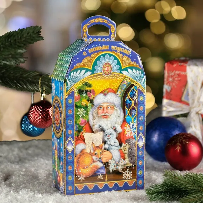 Коробка выполнена из качественных материалов, которые обеспечивают сохранность содержимого. Она имеет яркий и красочный дизайн, который отражает атмосферу Нового года.