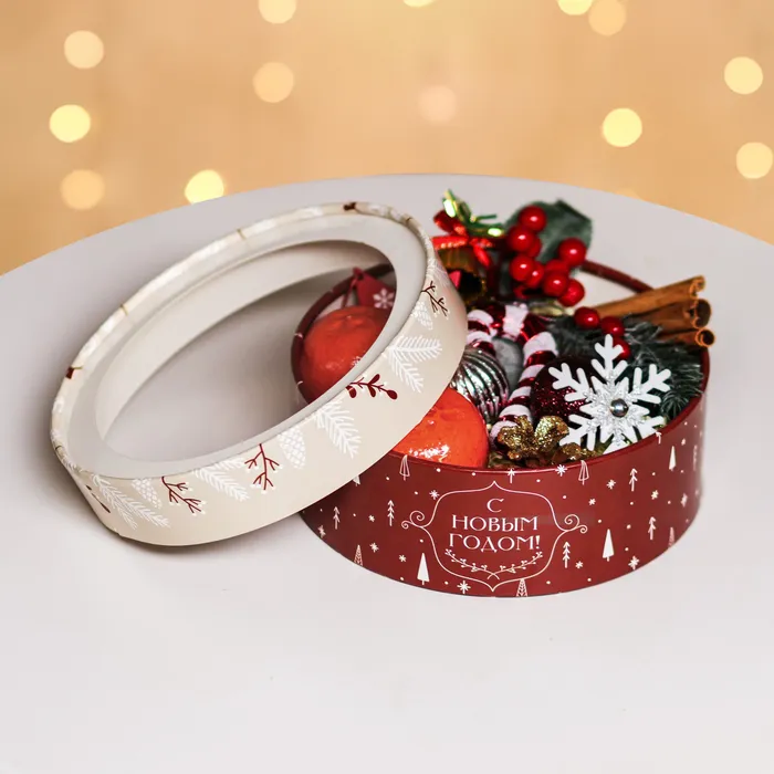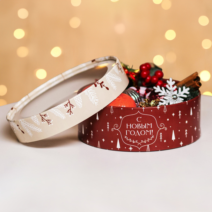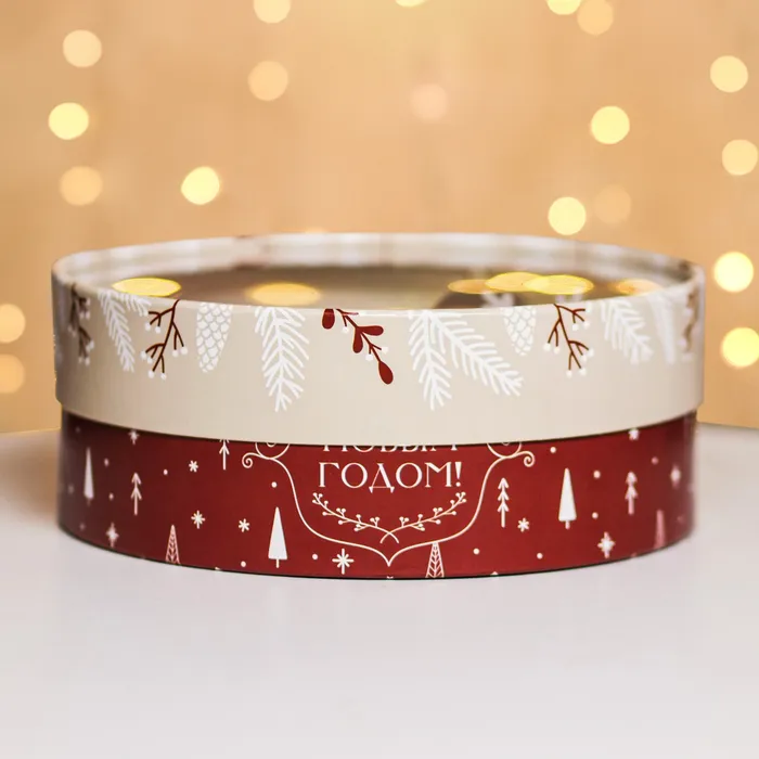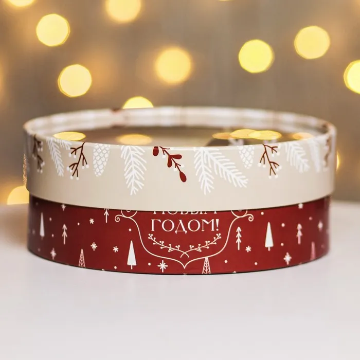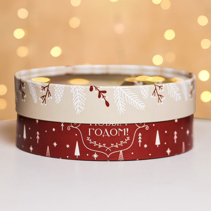 Коробка подарочная новогодняя для макарун тубус с окном «Хоровод ёлочек» 18×18×6 см — Характеристики