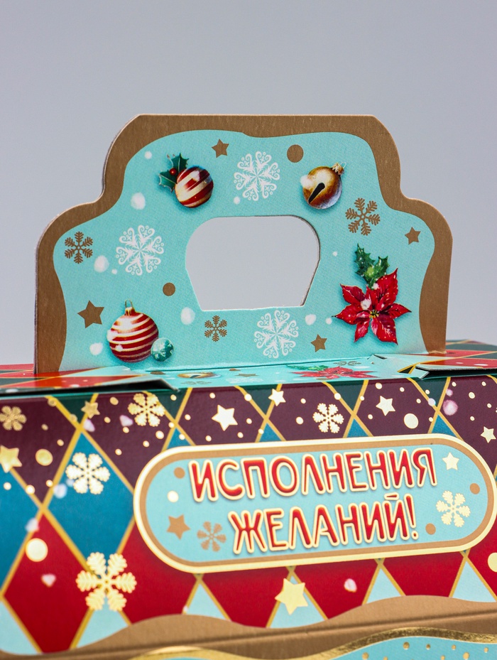 Для волшебных моментов: Яркое оформление с тематическими надписями создаёт атмосферу новогоднего чуда. «Исполнения желаний» — решение для тех, кто верит в магию праздника и хочет дарить близким не просто подарки, а настоящие эмоции.