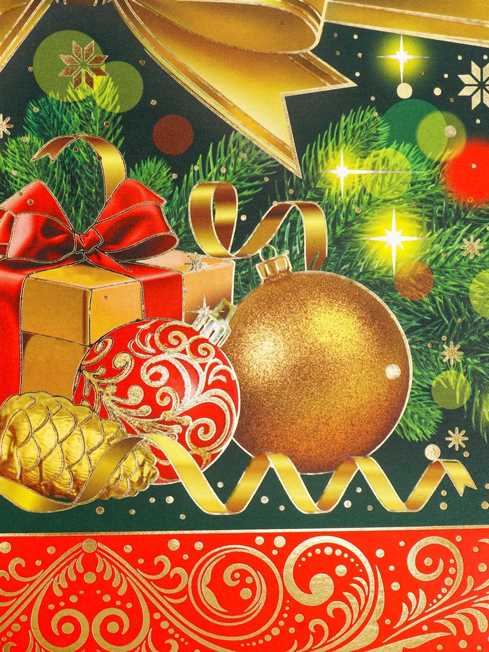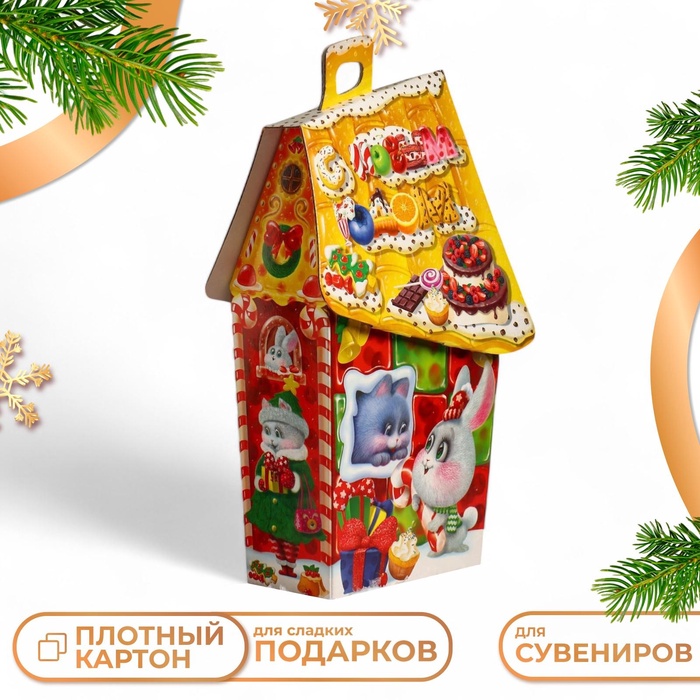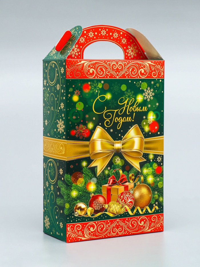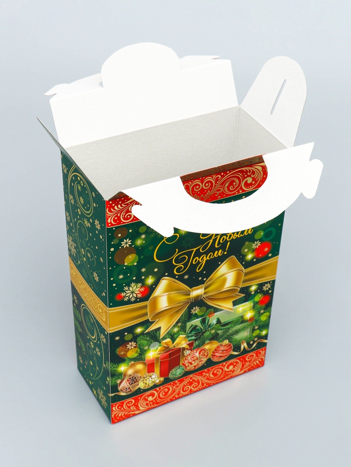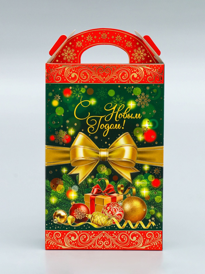 - Праздничное оформление: Зелёный фон с зимними узорами и новогодними надписями. Фигурная форма с имитацией бантика делает коробку нарядной без дополнительного декора.