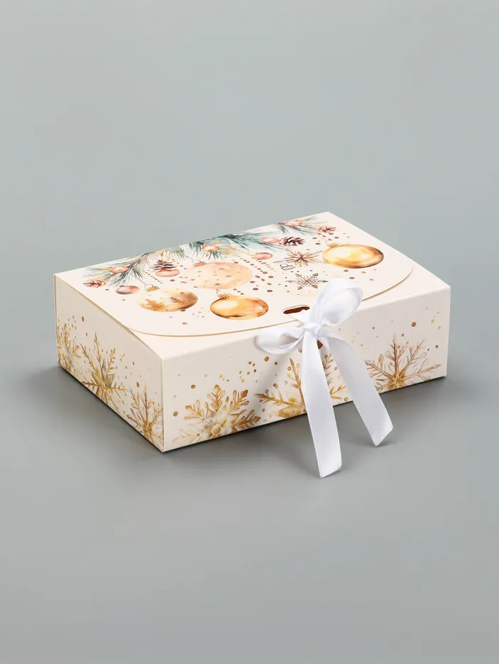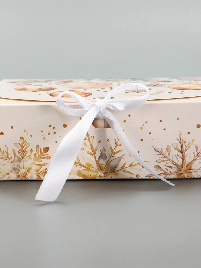 Новогоднее сияние в каждой детали! Коробка «Кристальный Новый год» — праздничная упаковка для небольших, но ценных подарков. Бежево-золотистый дизайн с новогодними узорами создаёт ощущение зимнего волшебства.