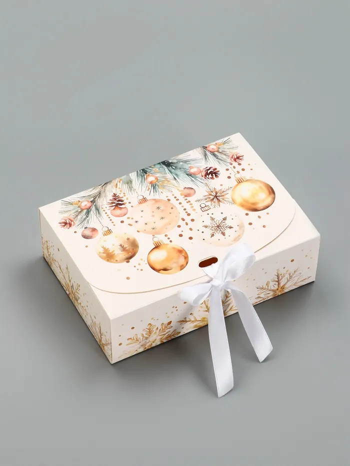 Для кого подойдёт: Эта коробка — выбор для тех, кто ценит стильные детали. В неё можно упаковать новогодний набор: маленькую бутылку игристого с парой хрустальных бокалов. Или положить бижутерию, дополнив веточкой настоящей ели для аромата. Универсальный дизайн делает коробку уместной как для подарка близким, так и для корпоративных презентов коллегам.